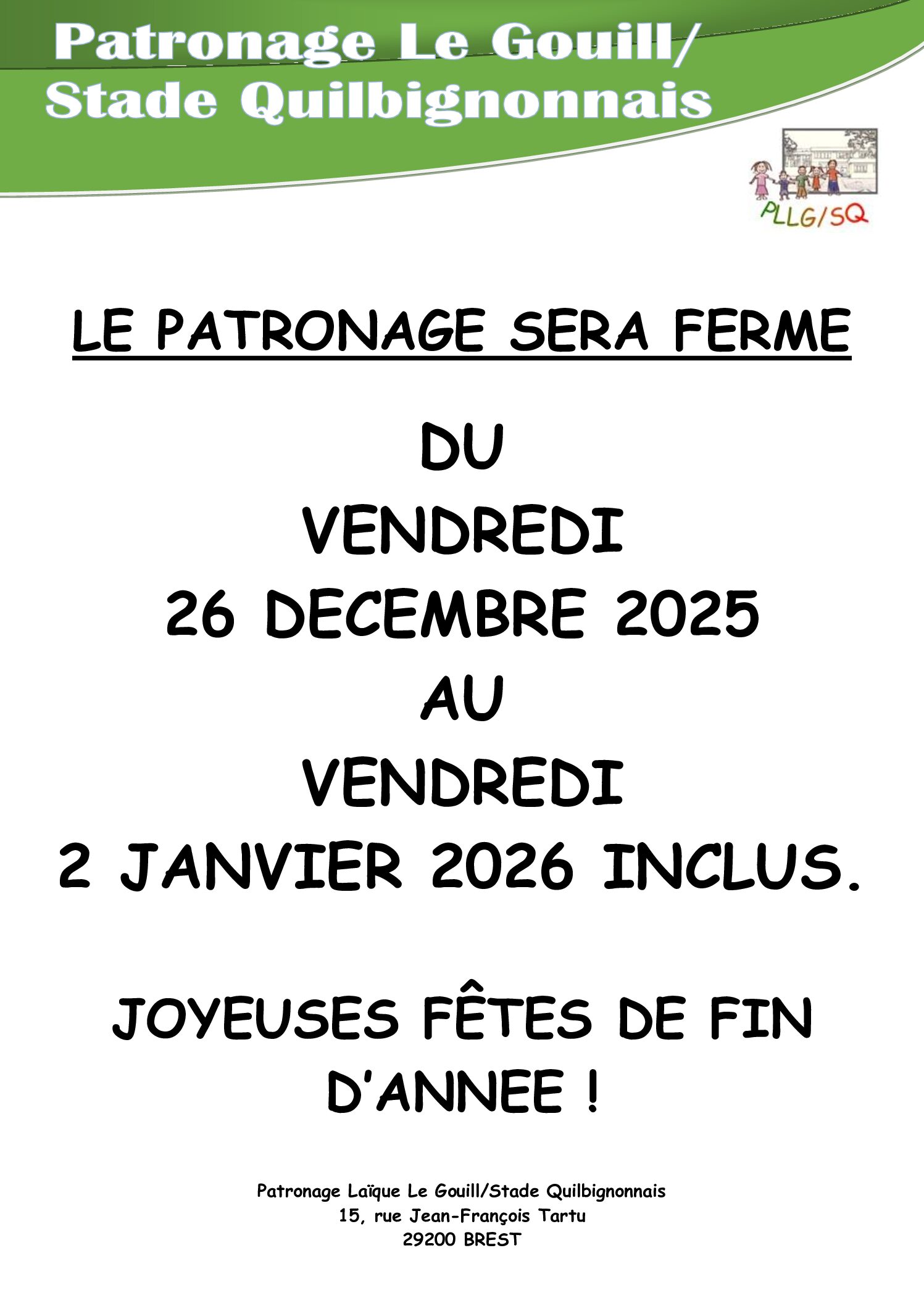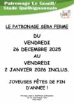 FERMETURE DU PATRONAGE Du vendredi 26 décembre 2025 Au vendredi 2 janvier 2026. Joyeuses fêtes de fin... Lire plus → Fermeture du patronage